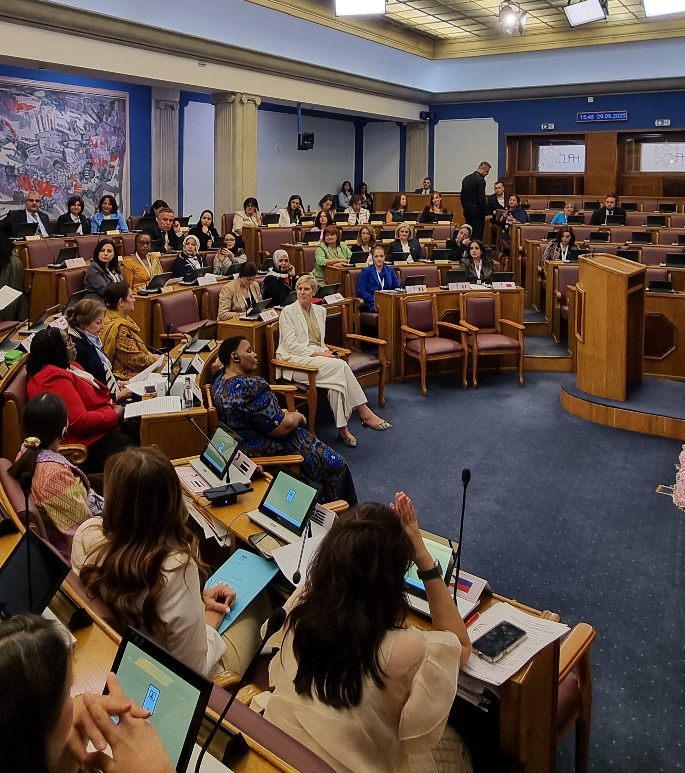 Adresându-se participanților în numele delegației române în cadrul sesiunii dedicate delegațiilor naționale, senatoarea Ana-Cynthia-Ioana Păun s-a referit la importanța prezenței femeilor în procesele de decizie și în conducere, aceasta fiind un pas esențial pentru o guvernare mai deschisă și pentru o funcționare sănătoasă și echitabilă a unei societăți democratice. În continuare, a subliniat o serie de progrese legislative și programe naționale care vin în ajutorul femeilor, precum legea care introduce sistemul de monitorizare a agresorilor cu brățări electronice, legea prin care vârsta consimțământului sexual a fost ridicată de la 14 la 16 ani, legea privind depresia postpartum, extinderea programului de vaccinare gratuită HPV pentru fete și băieți între 11–26 de ani. Totodată, senatoarea Păun s-a referit la înființarea Comisiei speciale comune a Camerei Deputaților și Senatului în domeniul legislației privind prevenirea, combaterea și sancționarea violenței domestice – ”România fără violență domestică” care are ca obiective analizarea legislației și propunerea de noi măsuri și inițiative legislative în domeniu. În încheiere, senatoarea Păun a pledat pentru un efort comun și solidaritate între femeile lideri politici, indiferent de apartenența politică, pentru a îmbunătăți reprezentarea femeilor în parlamente.